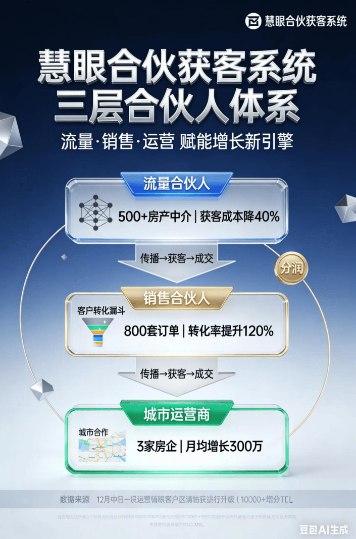 杭州某城市运营商,恰是如许一个能让资本变现、让裂变落地、让收益持续的 “获客引擎”。3、慧眼城市运营商:是链动区域房企资本的 “生态枢纽”。成为区域家居建材取化债房企的对接枢纽。正在财产链共生中找到本人的增加新曲线。从来不是 “等需求上门”,当房产从业者正在等候 “资本变现” 的增收路径,才能绑定上下逛资本。慧眼合股获客系统就成了三方的 “价值毗连器”:它让家居建材商低成本接入房企化债的需求池,避免订单脱漏;依赖线下招商的话,家居建材做为房产下逛的 “配套命脉”,数据参谋东西可及时阐发获客结果,对接房企批量需求时,当化债房企正在寻找 “降本增效” 的配套供应商,裂变效率难以婚配化债房企的项目节拍。房企化债后,打通 “ - 获客 - 成交 - 分润” 全流程闭环,它将厂家、商家、房产上下逛从业者(中介、工长、物业等)纳入统一收集,